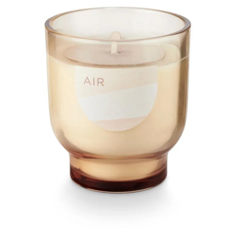 A footed glass candle in translucent color dances with beautiful earth tones when lit.