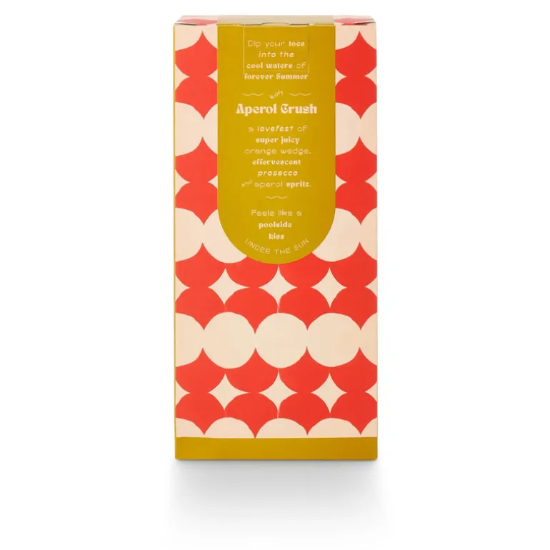 A translucent glass diffuser with a playful stacked bubble shape is tucked inside a pool towel inspired patterned box.