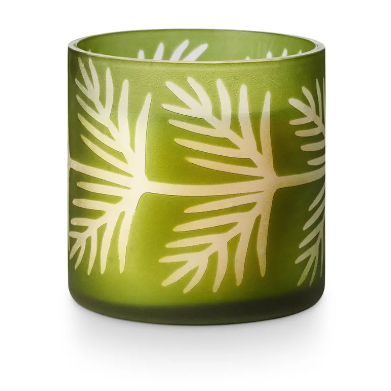 A soft frost exterior pairs with a bold pine branch print on this mercury glass candle.