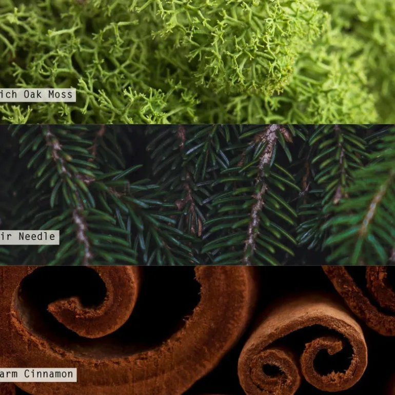 Grounded in rich oak moss with a heart of fir needle kissed with warm cinnamon.