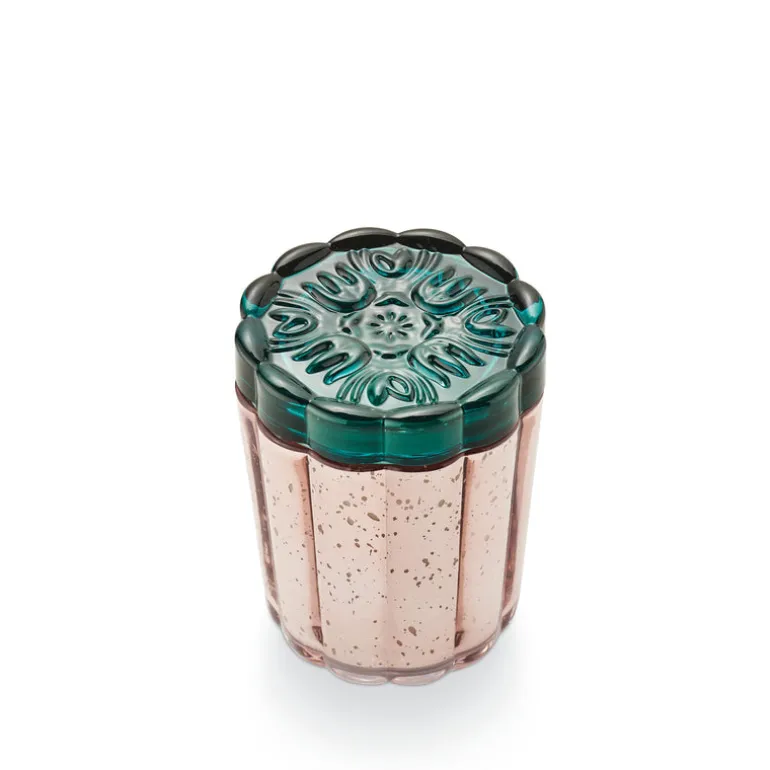 Turn heads with this lightly speckled mercury glass with a pressed glass, floral-shaped lid.