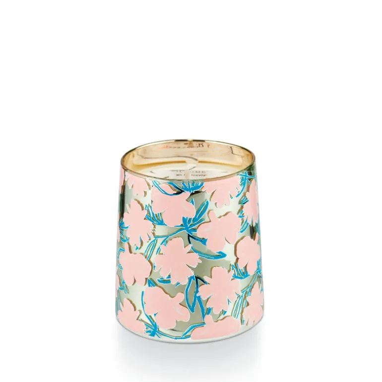Oh so lovely milky glass is wrapped in a bright floral pattern and garnished with a floral disk insert.