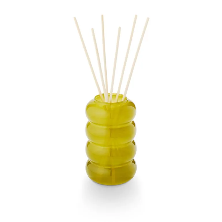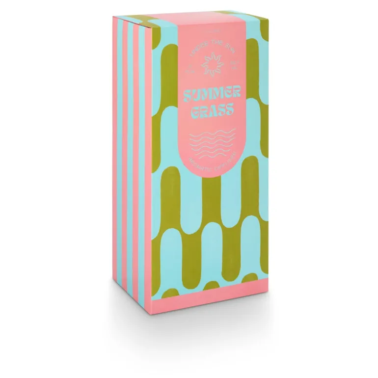 A translucent glass diffuser with a playful stacked bubble shape is tucked inside a pool towel inspired patterned box.