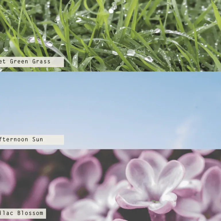 A thrill of cold hose water on warm skin with wet green grass, full afternoon sun, and lilac blossom.