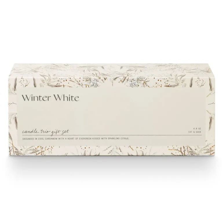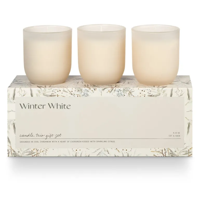 Three frosted glass candles sit inside a beautiful box with hand painted art and pops of gold foil.