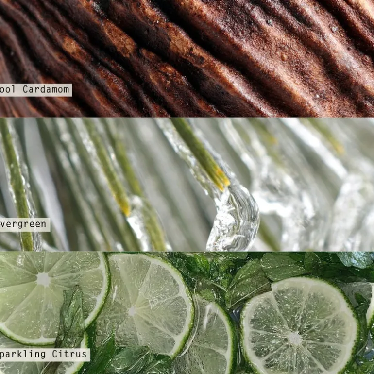 Grounded in cool cardamom with a heart of evergreen kissed with sparkling citrus.