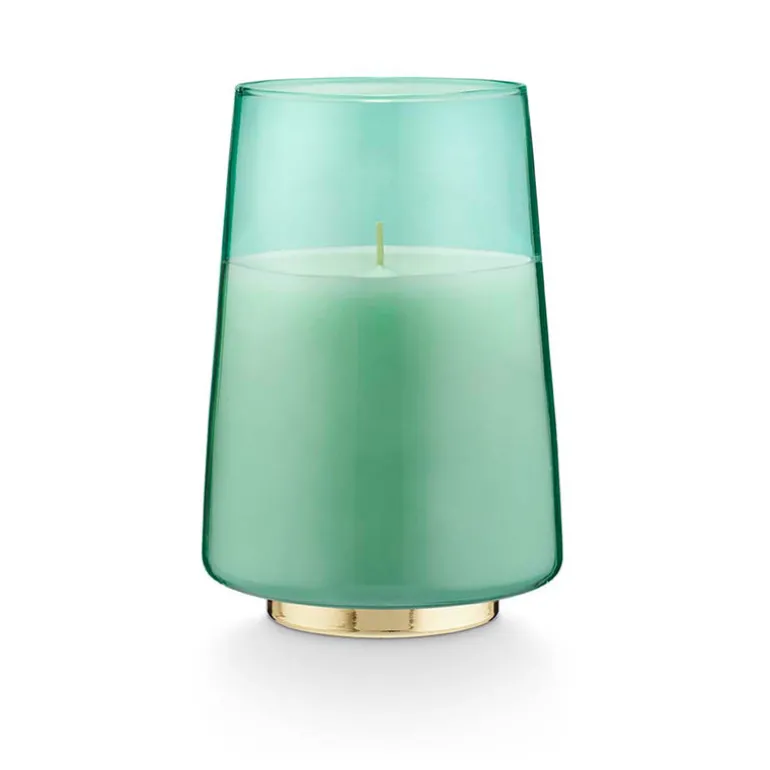 A lovely glass candle designed with an ombre effect, delicately tapered shape, and shiny gold base.