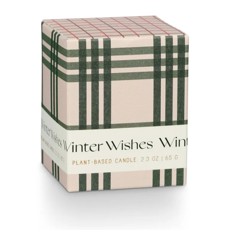Cheerful votives are pre-wrapped in simple holiday plaids to warm your spirit.