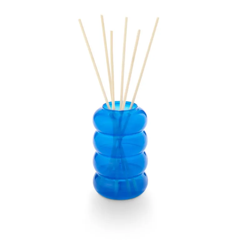 A translucent glass diffuser with a playful stacked bubble shape is tucked inside a pool towel inspired patterned box.