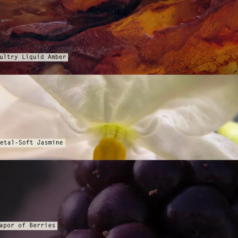 Grounded in sultry liquid amber, with a heart of petal-soft jasmine, kissed with a vapor of berries.