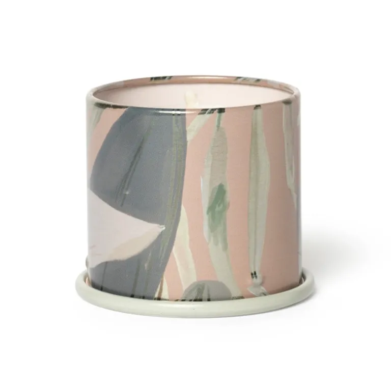 Designed as a pop of pattern, our vanity tins have a full wrap label on textured stock, interior pattern with metallic details, and a color rolled edge to complement the colored wax. We use tin for its lovely illuminating qualities and because it is infinitely recyclable.