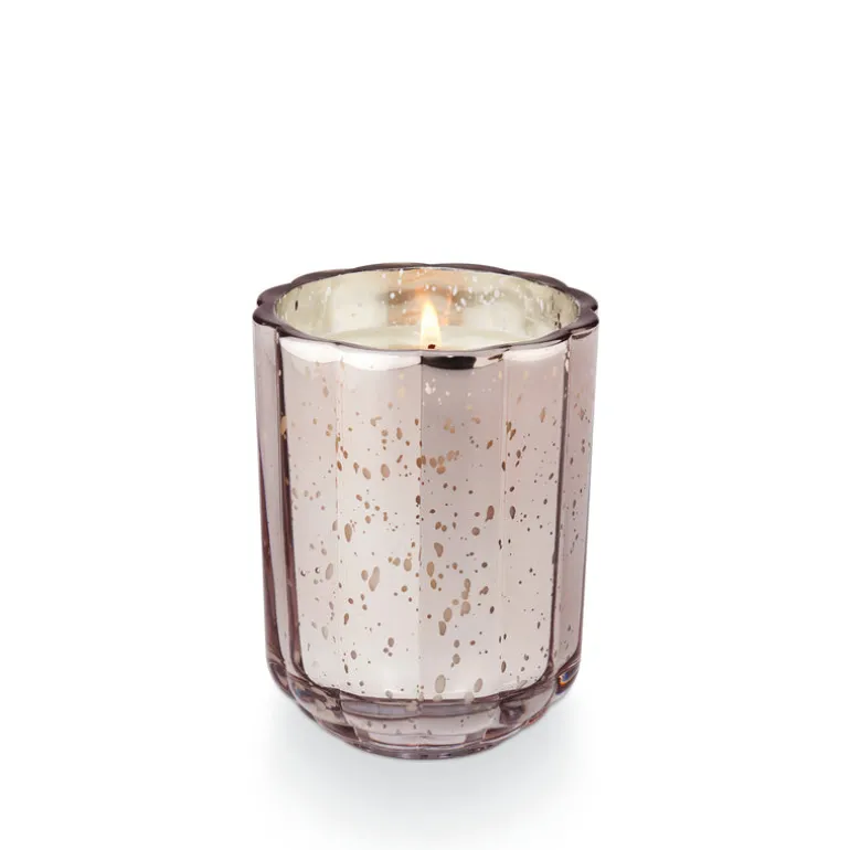 Turn heads with this lightly speckled mercury glass with a pressed glass, floral-shaped lid.