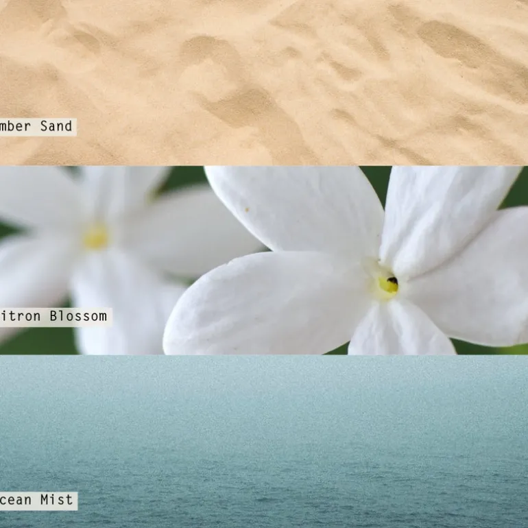 Grounded in amber sand with a heart of citron blossom kissed with ocean mist.