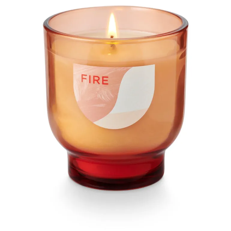 A footed glass candle in translucent color dances with beautiful earth tones when lit.