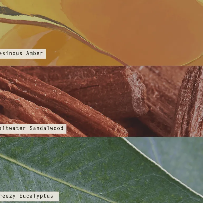 Grounded in resinous amber, with a heart of saltwater sandalwood, and kissed with breezy eucalyptus.